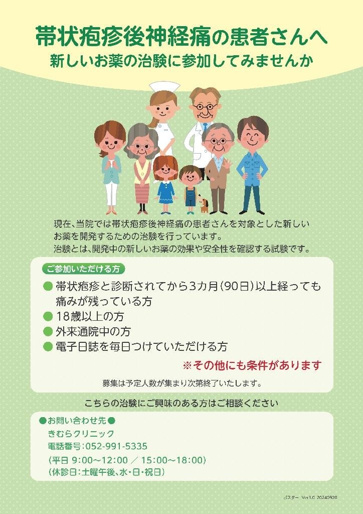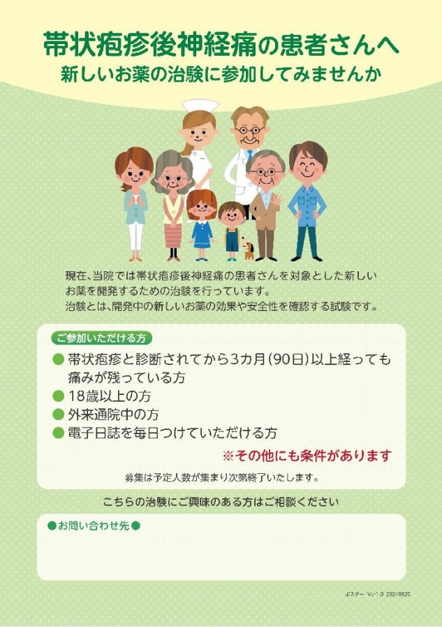 帯状疱疹後神経痛の臨床治験を行っています(内服薬) 2025年10月03日(金) 治験に参加いただける方を募集しています。 詳しくは平日の13-17時に下記までご連絡ください。 場合によっては、ご参加いただけないこともございます。ご了承ください。